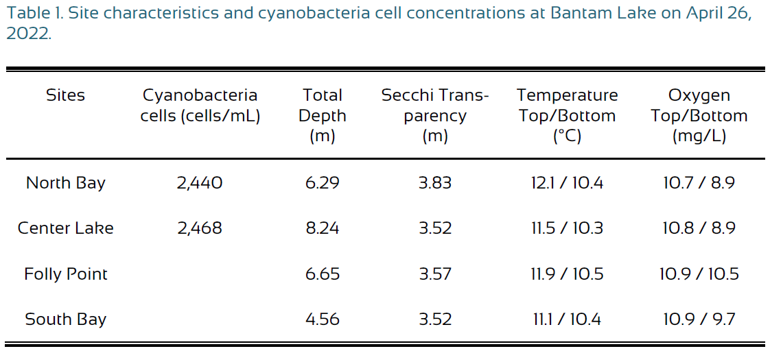 On Tuesday, April 26th, AER visited Bantam Lake to conduct biweekly cyanobacteria monitoring as part of the ongoing lake management program. Water column profile data, total depth measurements, and Secchi transparency data were collected from the North Bay Site (N 41.71087° W -73.21155°), the Center Lake Site (N 41.70056° W -73.22102°), a site west of Folly Point (N 41.70773 W -73.22638), and at a site in the South Bay region of the lake (N 41.69015 W -73.22728).